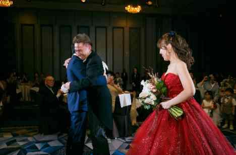 披露宴入場では、神前式のため叶わなかった新婦父と新婦の入場がついに実現。 会場中をバージンロードに見立てて歩きながら、新郎とのバトンタッチで熱い抱擁を交わす姿に、家族の深い絆と想いが伝わります。 周囲の親族やゲストも温かい視線と拍手で見守り、会場全体が祝福に包まれました。 笑顔と感動あふれる、心に残る特別なひとときとなりました。