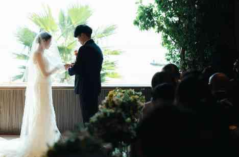 海の絶景と緑に彩られた温かな雰囲気のチャペルで挙式。オープンレターセレモニーでゲスト一人ひとりに想いを伝え、クスッと笑ったり涙したりする人も。「緊張しすぎて誓いのキスがあまりにも短く…」と、ハプニングもふたりらしいシーンに。開放感あふれるガーデンでコスメブーケトスなどアフターセレモニーも満喫し、心温まるセレモニーとなりました。
