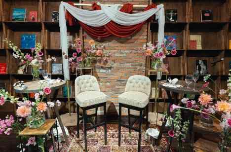 アンティークを思わせるシャンデリアや書棚など、知的な雰囲気を感じるシックな披露宴会場。こだわった衣裳も存分に見てもらえるようハイチェアでセンス良くコーディネートしました。また、ケーキの代わりにローストビーフへ入刀し、新郎新婦の母へサンクスバイトも。後にゲストにも提供し、「料理が美味しかった」と大好評となりました。