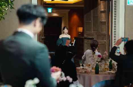 カラードレスは新郎にも当日まで内緒にし、ドレスの色当てクイズを実施。新郎が投票した色次第でBGMを変更し、元剣道部の新婦様らしい不正解のお仕置きも用意したので、より会場が一体となって盛り上がりました。続いてデザートビュッフェが登場すると、ゲストが会場を自由に動きながら過ごし、カジュアルな雰囲気も楽しめるアットホームな結婚式に。