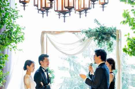 実は当日は大雨。ただ、祭壇から射し込む自然光とたくさんの緑を感じるチャペルは、雨天を忘れるほど明るく素敵な雰囲気。新郎入場はこだわりのステップでゲストを盛り上げ、友人夫婦からの想いのこもった誓いの問いかけなど、笑いあり涙ありのセレモニーに。また、リングボックスセレモニーで、サプライズでゲストにリングを運んでもらうなどドキドキの演出もゲストと一緒に楽しめました。