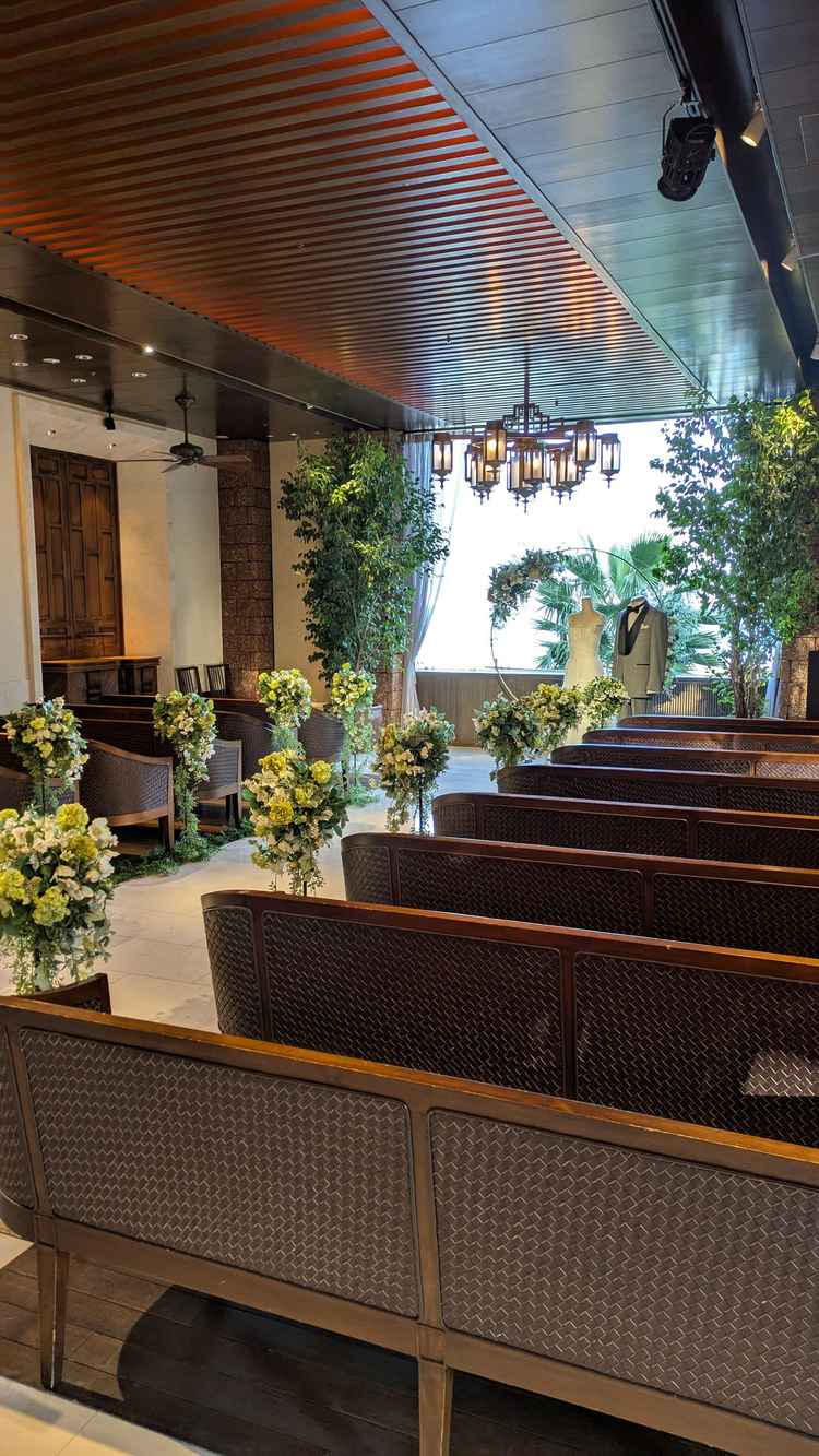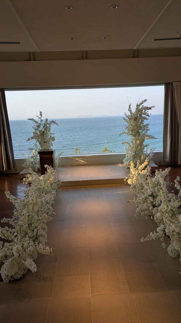 ホテルから車で移動となり離れてはいますが、海のそばにある挙式会場の眺めが最高でした。またキッチンが披露宴会場内にあり温かい料理が提供される点がよかったです。