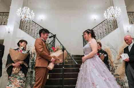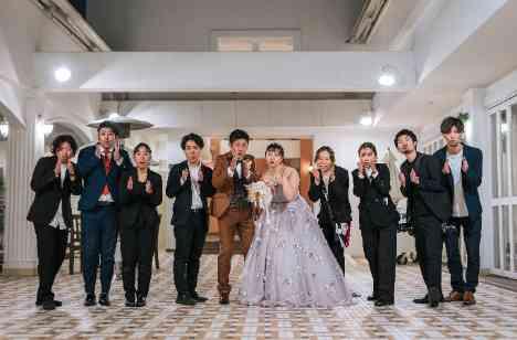 挙式後にガーデンでアフターパーティーを楽しんだおふたりの披露宴が始まります!なんとガーデンから入場したおふたりの衣装が和装に!歓声の中続けてウェディングケーキの登場★歓談を楽しんだ後、再入場のおふたりの衣装はカラードレス&タキシードに★そしておふたりと共に現れたのはBBQ&デザートビュッフェ★さらにさらに新郎様から新婦様へのBIGサプライズ!