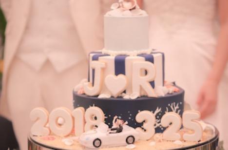 おふたりのウエディングケーキは【リゾート感】を演出するものに! おふたりでのファーストバイトはもちろん、 ゲストの方へのサンクスバイトでは、おふたりのキューピットとなる方をお呼びしておふたりより、感謝の気持ちをお伝えしました。