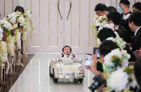 お二人のお子様にリングボーイという大事な役割を担っていただきました♪お子様をデコレーションされたラジコンカーに乗せて緊張気味の息子君の登場!!本当にかわいくゲストからの「かわいい!」がやみませんでした!
