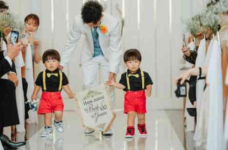 新郎様入場・・・かと思いきや まず登場したのはおふたりの双子の愛息子くんたち! 立派にフラッグボーイを務め、 その後はパパである新郎様と三人で祭壇前まで入場! お次は新婦様の入場です。 お父様にエスコートを、お母様には最後のお支度であるベールダウンをしていただきました♡ ここで再びチャペルのドアが開き、 登場したのはおふたりの愛犬くん! リングドックを完璧に勤めあげました★