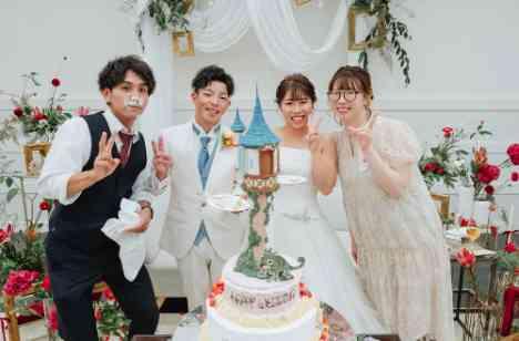 ここでもおふたりの大好きな世界観がふんだんに組み込まれた オリジナリティあふれる演出にゲストの皆様大盛り上がり! 運ばれてきたウェディングケーキは 再現度の高さに 新郎新婦様も口元を抑えてびっくり! ”もったいなーい” と言いながら、大きな大きなスプーンで 新婦様からファーストバイト♡ その後はご友人様にサプライズバイトをプレゼント♪ 新郎様のご友人は新郎様にしてやられました★