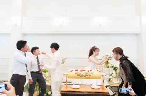 披露宴のメインといっても過言ではないであろうケーキ入刀・・・! と思いきや?! ゲストの皆様の前に登場したのはなんと長い長いバームクーヘン! まさかの登場にゲストの皆様は 「え~!すご~い!」と絶賛の嵐★ 入刀後はバームクーヘンの食べさせ愛♡ その後はご友人様へのサプライズサンクスバイトで大盛り上がりをみせました★