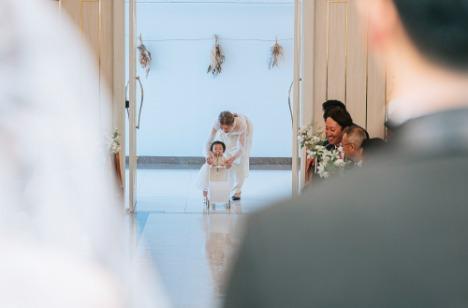お母様と熱いハグを交わして入場した新郎様 新婦様はお父様お母様に最後の身支度を整えていただき 生まれてからご結婚式まで歩んできた日々や思い出をかみしめ 一歩一歩思いをはせながら進みます ここで登場したのはカートに乗ったリングガールちゃん♪ ママと一緒に上手におふたりの元まで指輪を届けてくれました★ 皆様からの賛同と祝福の拍手で見送られながらチャペルを後にするおふたり