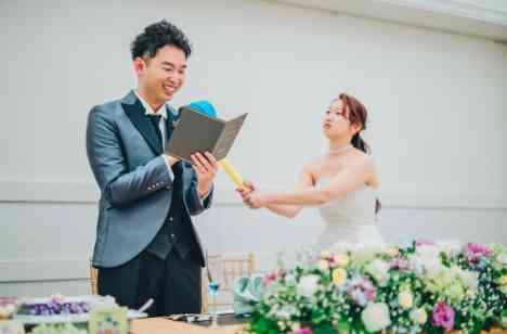 続いて披露宴が始まりました! テラスからおふたりが入場すると、 まずは新郎様からのウェルカムスピーチ・・・! と思ったら、なんと新婦様の手元にはピコピコハンマー?! 言葉が詰まるごとに1ピコ! 緊張する新郎様に追い打ちをかける新婦様 そのほほえましい姿に、会場も笑いの嵐に包まれました