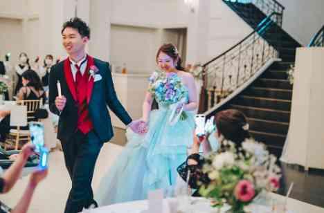 再入場はアールベルアンジェ名古屋の魅力、 Y字階段から! ゲストの皆様には、ドレスの色当てクイズと称して 新婦様のカラードレスの色を予想してペンライトのカラーを選んでいただき、 再入場のタイミングで点灯させていただきました★ まるでアーティストのライブのような雰囲気に、 新郎新婦様もワクワク楽しそう♪