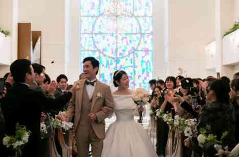 いよいよセントセシリアでの人前式が始まります お父様にエスコートをしていただきながらヴァージンロードを一歩一歩ゆっくりと進みます 新郎様の元へと到着すると、 固い握手を交わして新婦様を新郎様の元へエスコートするお父様 これまでの想い出がよみがえり、お目もとには素敵な涙がきらりと光っていました