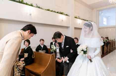 いよいよセントセシリアでの人前式が始まります お父様にエスコートをしていただきながらヴァージンロードを一歩一歩ゆっくりと進みます 新郎様の元へと到着すると、 固い握手を交わして新婦様を新郎様の元へエスコートするお父様 これまでの想い出がよみがえり、お目もとには素敵な涙がきらりと光っていました