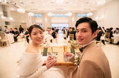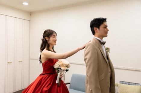 お色直しタイムで一度会場を後にした新郎新婦様 ドレスの色当てクイズを会場で行っていたのですが、 実は新郎様もカラードレスのお色は知りません! セカンドミートを行い、肩をトントン・・・ 真っ赤なドレスに身を包んだ新婦様の美しさに、 思わず笑みがこぼれた新郎様でした♡ 会場に再入場するとドレスの色当てクイズの当選者発表! じゃんけん大会で勝ち残った3名にはおふたりから景品が贈られました♪