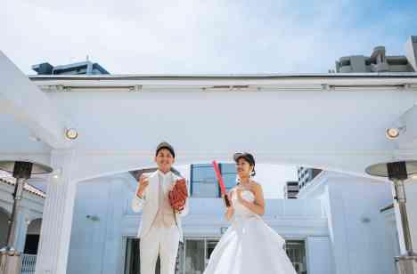 続いて披露宴のスタートです♪ オープニングムービーが結ぶと、 ガーデン側のカーテンが開き、登場したのは野球のピッチャー&バッター姿の新郎新婦様! ここで、新郎お父様をお呼びし、キャッチャー役をお願いして、始球式が始まりました! まさかの展開に、お父様もゲストの皆様もびっくり! 皆様へのサプライズ演出大成功で始まりました★