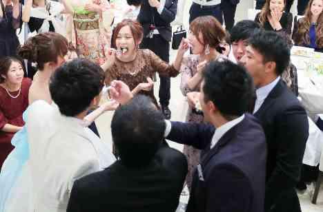 ウェディングケーキはご新婦様デザインのものを当館パティシエが心を込めてお作りいたしました!そんなケーキで行うファーストバイト新婦様から新郎様へはフライパンで行いました!新婦様からたくさんの愛情をしっかり受け取っていただきました。その後友人へサプライズサンクスバイト!8名で円になって食べさせあいました!ゲストも驚くサンクスバイトとなりました!