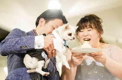 ケーキ入刀後、おふたりのファーストバイト!そのあとは大好きなゲストのどなたかへサプライズ&サンクスバイト!そのゲストは・・なんとリングドックを務めたワンチャン!!パティシエが作成したワンチャン用のケーキを「あーん!」の掛け声とともに美味しそうに食べていました★サプライズバイトの演出が結んだ後も、ケーキを最後まで食べていました!