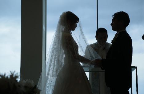 青い空とキラキラと輝く海が広がるチャペルで、大切なご親族様のみをご招待した挙式。 入場後カーテンが開く演出は、ゲストの皆様へのサプライズ! 真っ白な会場と、前面ガラス張りでとても明るく自然光がたっぷり入ります♪ オテルグレージュだからこその「非日常感」を一番体感できる場所です。ゲストの方とも距離が近く、アットホームな場となります!
