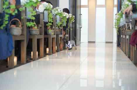 家族、友人に見守られる中ドキドキしながら 登場しました 皆さんが優しく見守っていてくれたので すぐに緊張がほぐれました! 海が見える綺麗景色の式場で楽しく式をあげれることができとても幸せでした! 念願だったリングドックができて愛犬くんもしっかり 皆んな所に行き可愛い姿を見せてくれたので大成功でした!