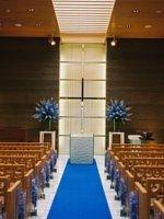 ロイヤルブルーのバージンロードやチャペル内の装花、ブーケ、フラワーシャワーなどにも青い花を使用して統一感あるコーディネイトを演出します。青は幸せを呼ぶ色、誠実、純潔を象徴する色とされており、結婚式のおまじないとされる『サムシングブルー』にはふたりの誠実な誓いという意味も込められています。