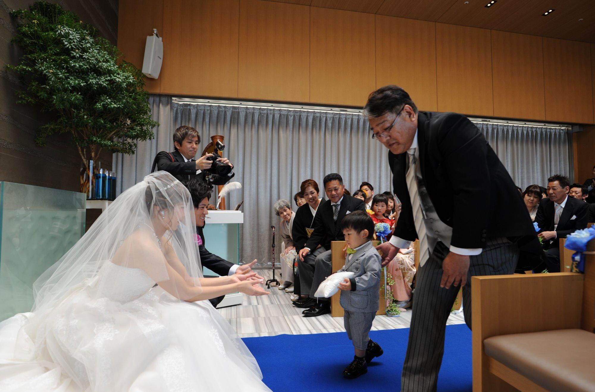 挙式はサムシングブルーに彩られた音楽堂にて、キリスト教式にて執り行いました。新郎新婦のお子様であるとあくんにはリングボーイの役をお願いし、照れながらもしっかりと努めてくれました!挙式の後は、とっても晴れやかな気候の中、新婦様手作りのスターシャワーとエンジェルシャワーでゲストの皆様にお祝いをして頂き、一緒に楽しい時間を過ごしました。