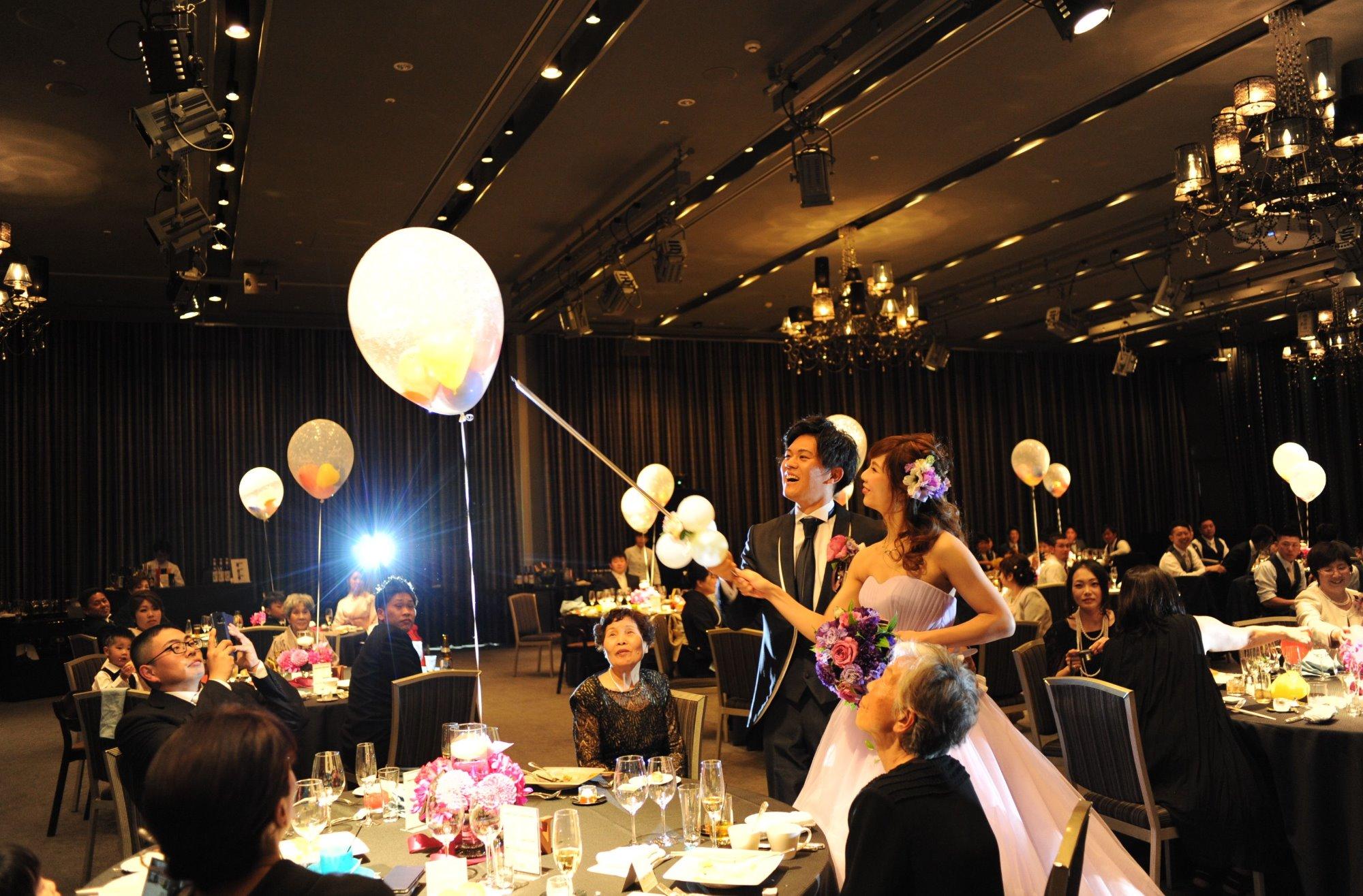 おふたりがゲストの皆様に楽しんでいただける演出として考えたのが、スパークバルーンの演出!各テーブルのバルーンをスパークしていき、皆様には中のハートのバルーンをキャッチしてもらいます。そして黄色を見事キャッチした方にはプレゼントをお渡し!お子様から大人まで楽しんで頂ける演出になりました!