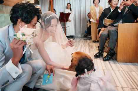 アークリッシュの結婚式は大切なペットと過ごすことができます! 実は前撮りでも登場してくれたわんちゃん とってもお利口さんな事は知っていましたが、当日も100点満点◎ しっかりと指輪を届けてくれたうえ、おやつの催促「お手」も完璧! チャペルの中でもリラックスして過ごしてくれ、ゲストに近づいて愛嬌を振りまく場面も! 愛おしさ溢れる演出になりました