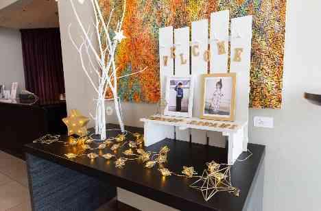 ゲストをお迎えするウェルカムスペースにはテーマに合わせて星のコーナーを作りました。ペーパーアイテムにも星が付いています。会場内のテーマは夜空に浮かぶキラキラの星。テーブルクロスはネイビーを、そしてナフキンは星型のイエローでコーディネート。