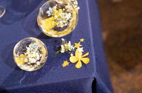 様々な種類のたくさんの星が会場の至るところにちりばめられていますが、実は会場を彩るお花にもしっかり意味が込められています。 テーブル装飾やブーケに使われている水色のお花は“ブルースター” 星型で名前に星が入っているので、まさしくおふたりにぴったりのお花です。一緒に飾ってある黄色い“モカラ”も星型のお花。 他にもご新婦様のネイルやヘアアクセサリーにもたくさんの星☆☆