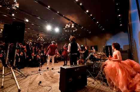 おふたりが特に楽しみにされていた演出がゲストの皆様へサプライズで行う家族バンド!! まずはお姉様・お兄様がB'zになりきって登場♪ そして途中から新郎がボーカル、新婦はドラムとして参加☆ 会場全体が一体感のある雰囲気となり、ゲストも大盛り上がり! とても楽しい演出になりました。