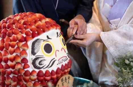 和装での演出だったのと、周りと被りにくいものにしたいという気持ちから立体型のダルマの形でお願いしました。ケーキ入刀の代わりに、2人で一緒にダルマの目入れをすることができ、披露宴の中でも特にお気に入りの思い出です!^^ 見た目も、形もイメージ通りで、キレイに仕上げていただき、参列した友達からは、「あれがケーキやったとビックリした!」と、印象に残るウェディングケーキになって私たちも嬉しかったです!♡