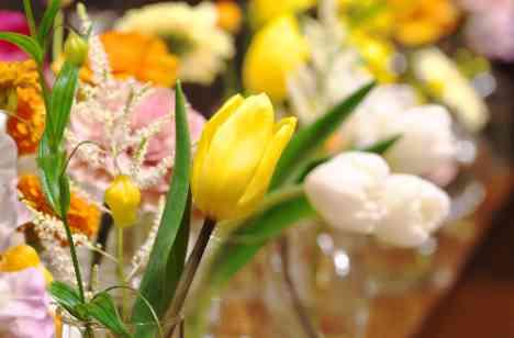 春と感謝の気持ちをゲストの方に伝えたくテーブルコーディネートは柔らかい印象のクロスにし、装花では春の花をなるべく使用していただくようにお願いしました。春の花が例年より気温が温かいため厳しいかもしれないと言われましたが、春の花を使用していただきテーブルには花と共にキャンドルも飾っていただきました。全体的に会場は華やかな印象よりも柔らかい雰囲気を演出していただきました。