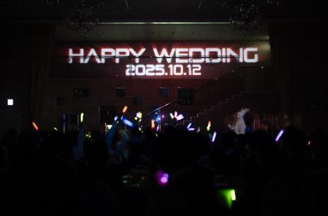 披露宴の入場曲マッピングの打合せは無かったですが、曲に合わせた映像で前撮りの写真もたくさん使っていただきました。 ドレスの色当てクイズを用意していたのでそれに合わせた演出を取り入れていただき曲に合わせてマッピングのなかにレーザーの演出もしていただきゲストの方々がペンライトを持っていたのでライブの様な時間になっていて会場の一体感がすごかったです。登場するまでワクワクしてとても楽しかったです。