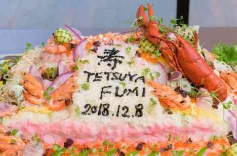 ③ちらし寿司カット 印象に残るシーンにしたいとの希望をプランナーさんやシェフに伝えました。ちらし寿司カットを提案してくださり、カットは宮島の厳島神社のしゃもじでしました。当日はみなさんに大変好評でした。