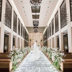 【光り輝く天空のバージンロード】ダイヤモンドを約40万個敷き詰めたチャペル。ドレス姿も映える光煌めくバージンロードを体感!大階段でのアフターセレモニー、親御様へ想いを伝える映像演出も必見です。