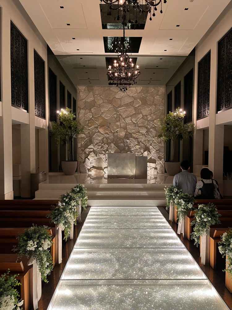挙式会場はダイヤモンドのような煌びやかな床で室内といえことを感じさせない明るい雰囲気だった。また、披露宴会場も現代風でおしゃれな雰囲気だった。