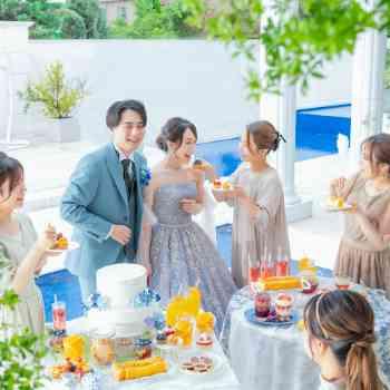- 貸切邸宅の専用テラスではデザートビュッフなどのおもてなしの演出やサプライズでお色直し時の再入場も可能