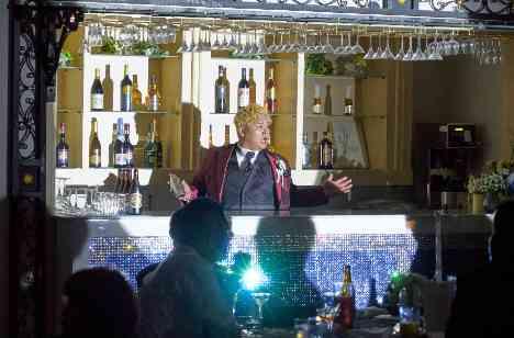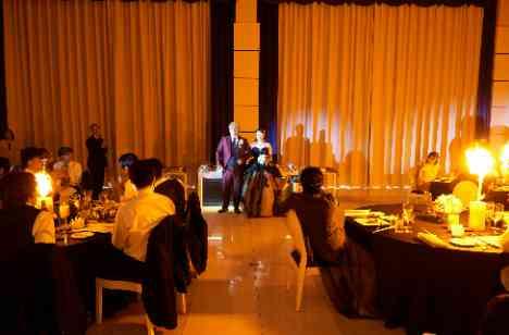 とにかく人を楽しませることが大好きな新郎様☆ そんなご新郎様がまさかの場所からご登場! 再入場の音楽が流れるとゲスト様は一斉にあたりを見回します。 おふたりを探しているご様子の中一気にピンスポットが一点に集中! そこになんとバーカウンターでバーテンダーに扮した新郎様が!! ゲストの皆様に見つかるとあわてて会場を後にしました☆