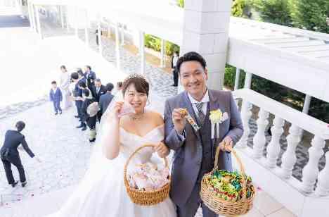 幸せを呼ぶカリヨンの鐘をおふたりで鳴らしていただき、ゲスト様からのフラワーシャワーを浴びてみなさまのもとへ♡ おふたりから幸せのおすそ分けはゲスト様全員で楽しんでいただけるお菓子まきを選ばれました🍩 大人もお子さまもみんなで楽しめる演出は、より一層ゲスト様との仲を深められたように感じられました♡