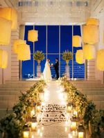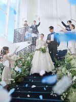 チャペルでの挙式後は、撮影スポットとして用意された大階段でのフラワーシャワー演出がオススメ! ブルーのカーペットに、ゲストからの祝福の花びらが鮮やかに映える。 人気の大階段で、まるで映画のようなワンシーンを再現。大勢のゲストと集合写真を撮影して、帰り際にプレゼントする演出もおすすめ!