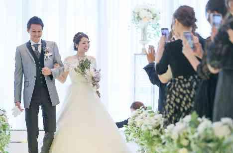 沖縄でご家族のみの挙式を行っていたおふたり。 そのため入場はあえておふたりで、大好きなBGMを流して入場しました。 ゲストに見守られながら無事にお式が結ぶと その後のアフターセレモニーではゲストにもご参加いただくため お菓子ブーケのトスをおこない、ご親族様をはじめご友人様も大盛り上がりでした。