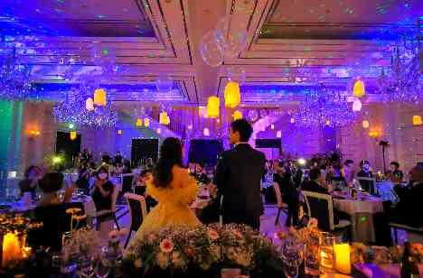 レーザー演出を使用して会場全体を照らし、夜空のような空間を演出… そこにゲストにもご参加いただきランタンを飛ばしていただきました。 お打合せの中で新婦様が「絶対やりたい!」と言ってくださった想いのこもった演出でした。 見たことのない演出に、涙する方や動画を撮影する方、笑顔で楽しまれている方… 会場が一体感に包まれとても素敵な空間となりました。