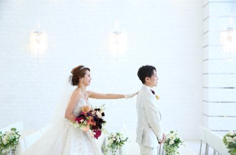 挙式前、チャペル内でファーストミートを行いました。 新郎様にはどのようなドレスを選んでいるか当日まで内緒にしていたため、 はじめてのドレス姿を見た新郎様の照れつつも満面の笑顔が印象的でした。 挙式は王道でありつつも、アフターセレモニーではゲストとの距離も近く ゲストにもアットホームな雰囲気の中お楽しみいただきました。