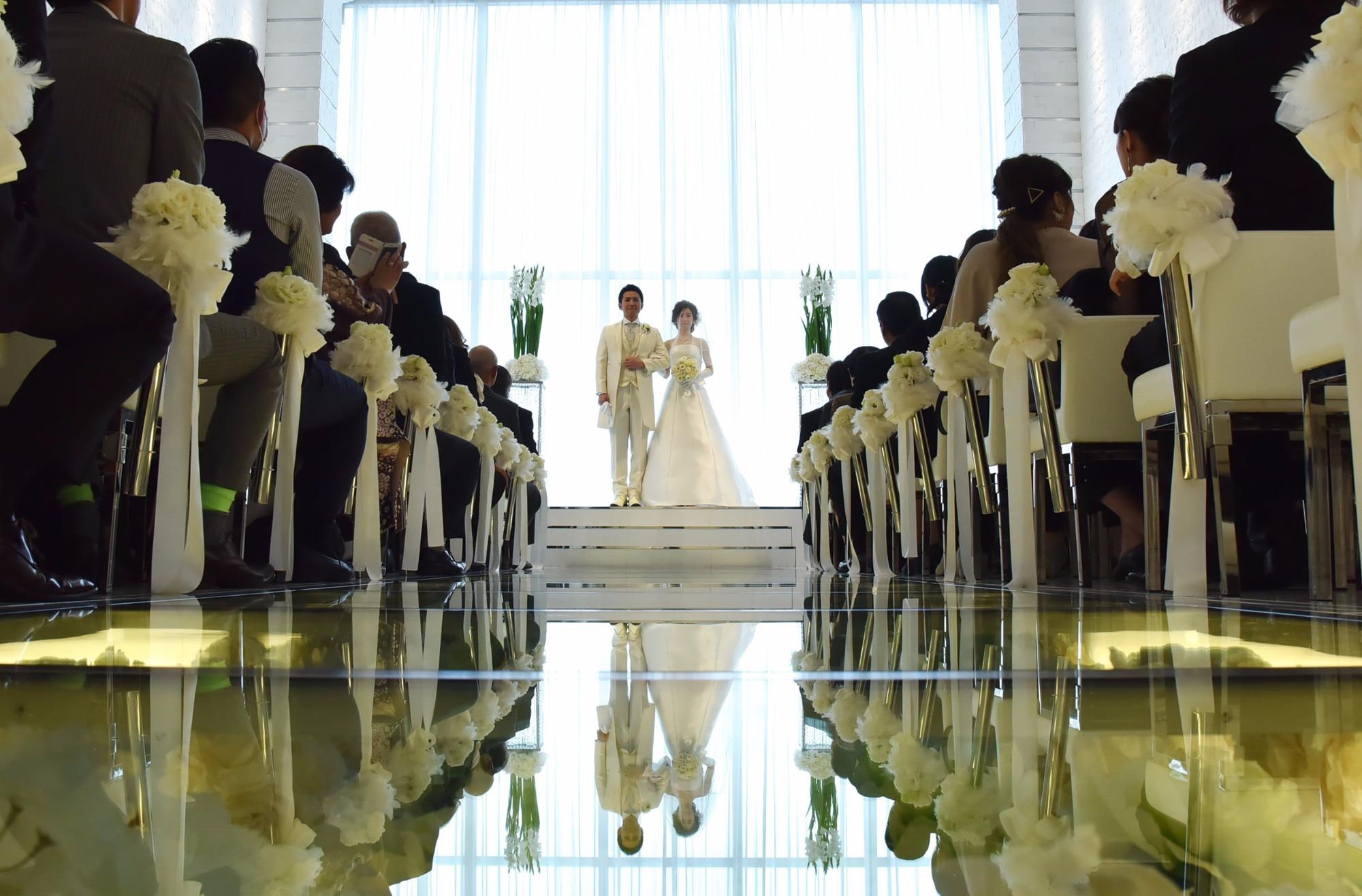 アルマリアン福岡のガラス張りの【フラワーバージンロード】は、おふたりの人生で関わってくれた方々皆様にありがとうという思いをもって、一歩一歩ゆっくりと歩んで頂き、一生涯幸福でありますようにという思いからつくられました。 おふたりは皆様に見守られながら【永遠の愛】を誓い、クリスタルスカイチャペルは温かい雰囲気と光に包まれとっても素敵なお時間となりました。