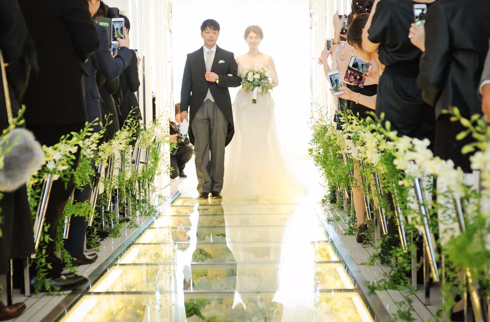 扉をあけると、目の前に【フラワーバージンロード】が続いており、 真っ白いチャペルの天井にはスワロフスキーの シャンデリアが輝いています。 その輝きの元、お二人には皆様に見守られながら 【永遠の愛】を誓って頂きました。 クリスタルスカイチャペルでの挙式は、 光に包まれ感動的なお式となりました。