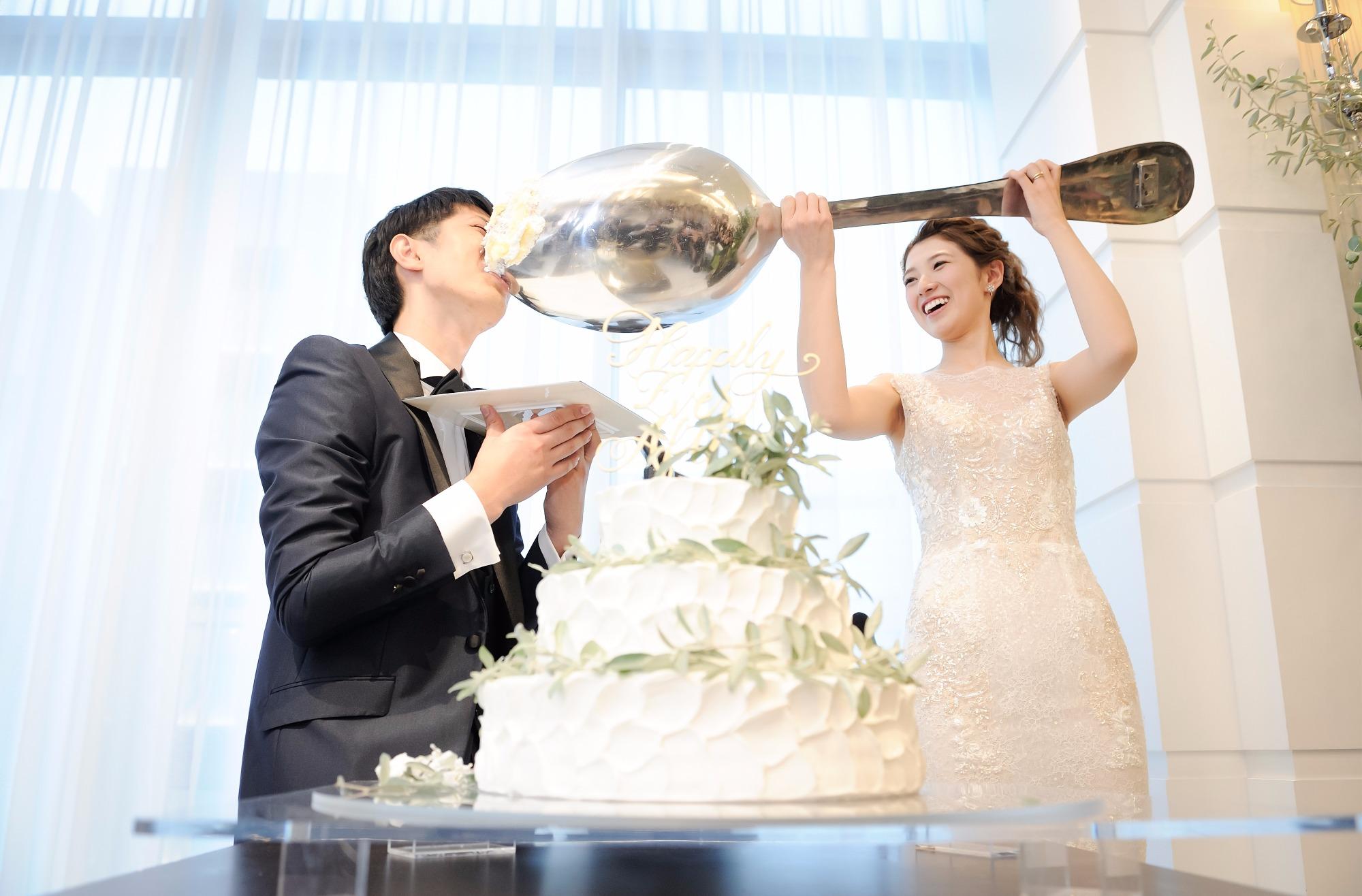 ケーキ入刀の際、BIGスプーンでご新郎様へファーストバイトしていただきました♡また、おふたりの中座中、ゲストの方へデザートブッフェでおもてなしです♪