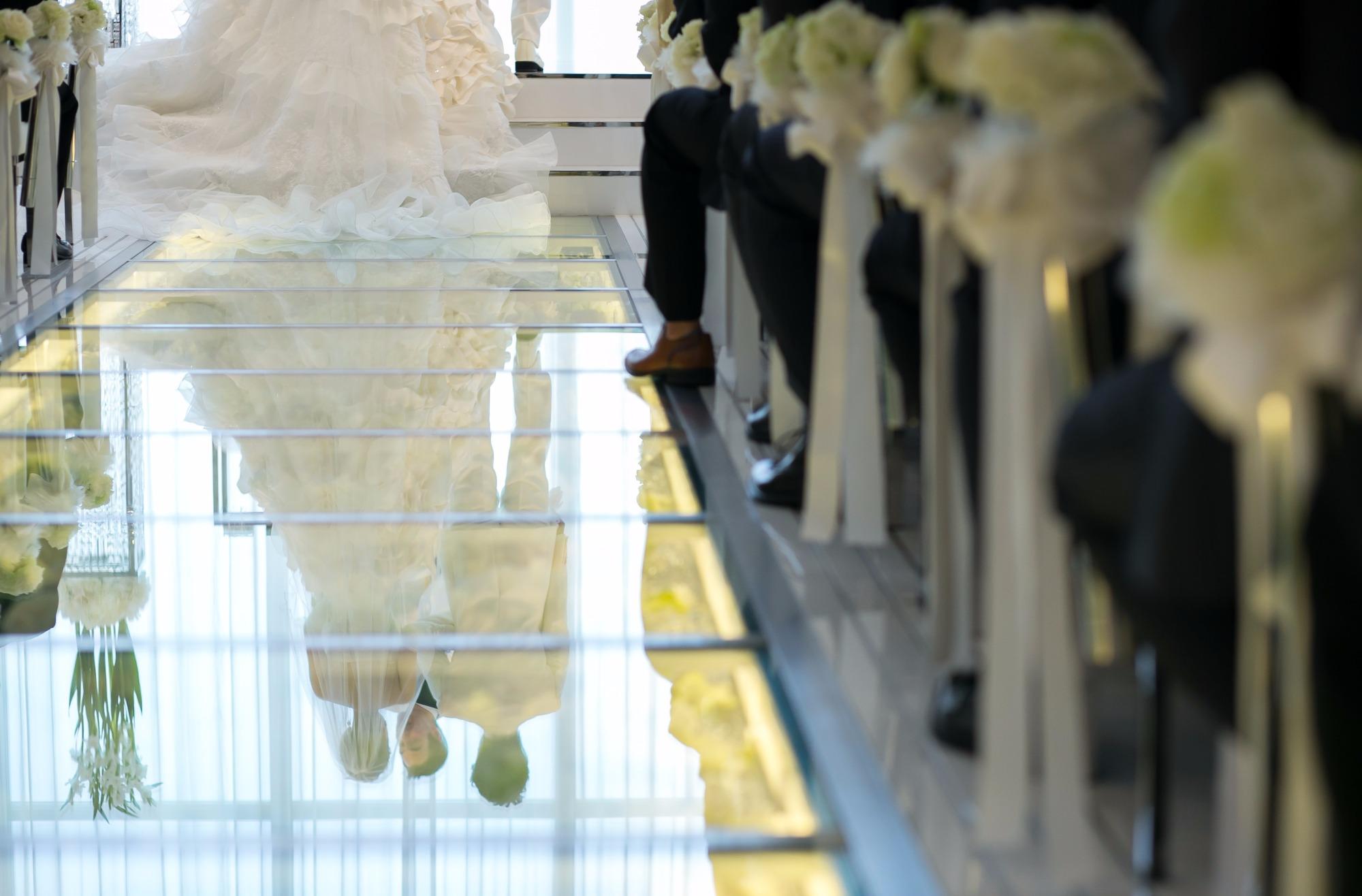 扉をあけると、目の前に【フラワーバージンロード】が続いており、真っ白いチャペルの天井にはスワロフスキーのシャンデリアが輝いています。その輝きの元、お二人には皆様に見守られながら【永遠の愛】を誓って頂きました。クリスタルスカイチャペルは、光に包まれ感動的なお式となりました。