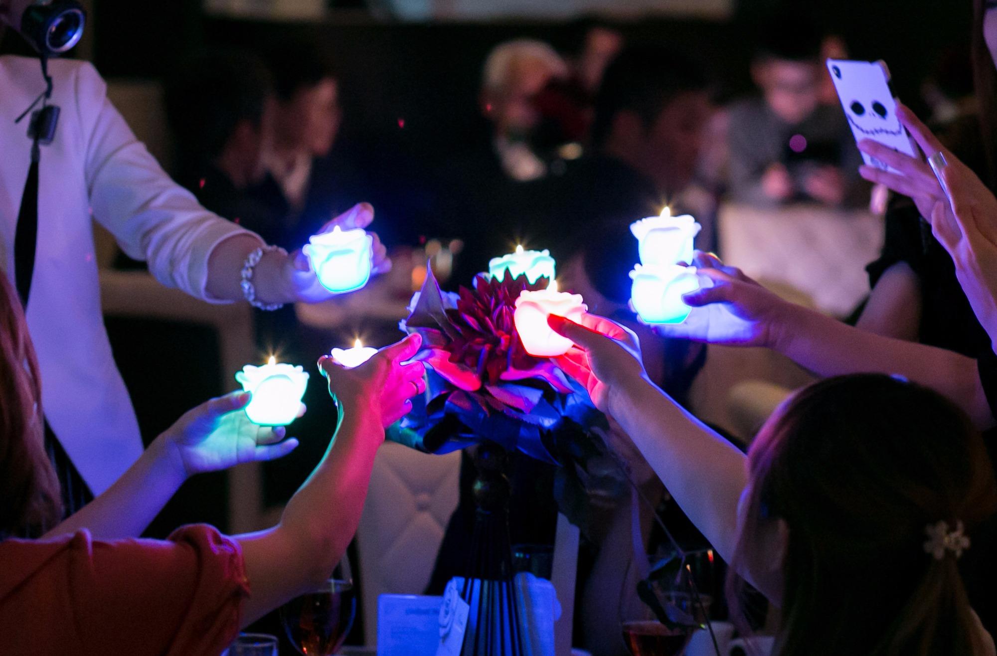 素晴らしい人生という意味を持つ【ラビアンローズ】のキャンドル。皆様でキャンドルリレーを行い、会場全体が幻想的な灯りに包まれました。