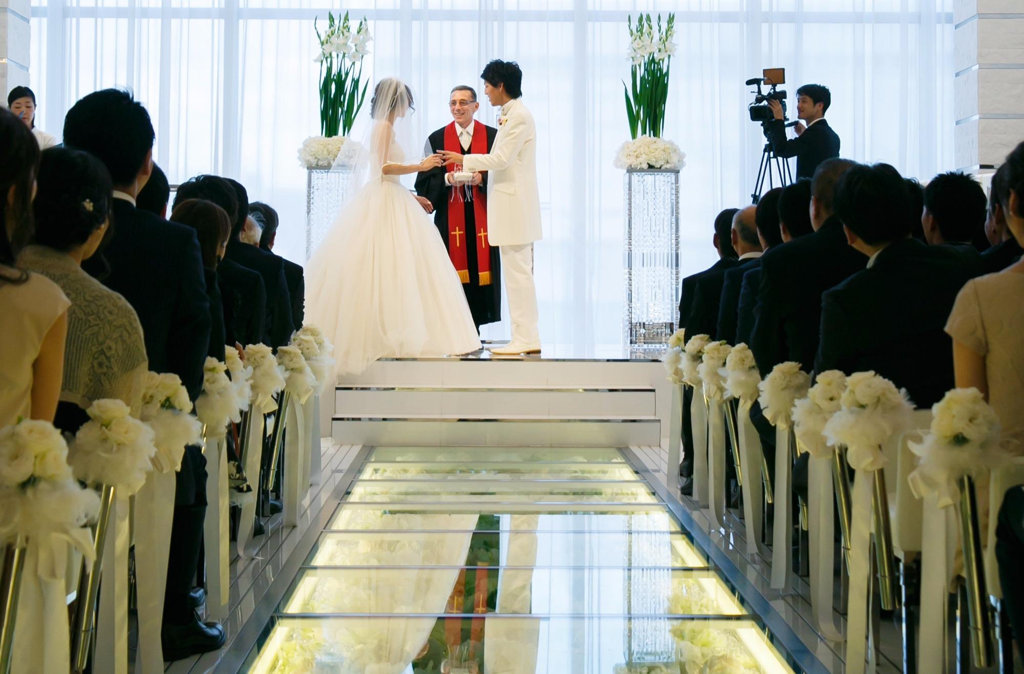 チャペルの扉をあけると、目の前に【フラワーバージンロード】が続いており、 真っ白いチャペルの天井にはスワロフスキーのシャンデリアが輝いています。その輝きの元、お二人には皆様に見守られながら【永遠の愛】を誓って頂きました。クリスタルスカイチャペルは、光に包まれ感動的なお式となりました。