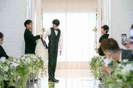 人前式では、ご新郎様の親御様にも活躍をして頂きたいとご希望があり、「ジャケットセレモニー」を行いました。お父様より、ジャケットを、お母様には、胸ポケットにブートニアを「最後の身支度」として送り出しをして頂きました。 人前式の醍醐味であるゲストからの立会人には、大切なご友人様から誓いの言葉を問いかけて頂きました。